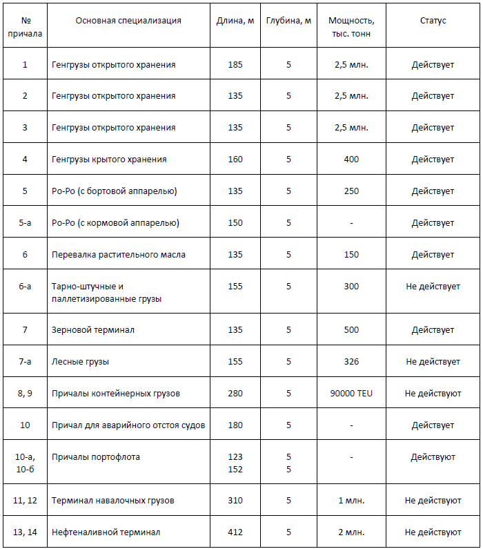 В настоящее время в порту в круглогодичном режиме осуществляют перевалку на десяти причалах (№№ 1,2,3,4,5,5-а,6,7,8,9), с общей длиной причального фронта 1603 п. метра и пропускной способностью 4 млн. тонн сухих грузов в год. Общая длина причальной линии с учетом запланированных причалов составит 2,9 км.
